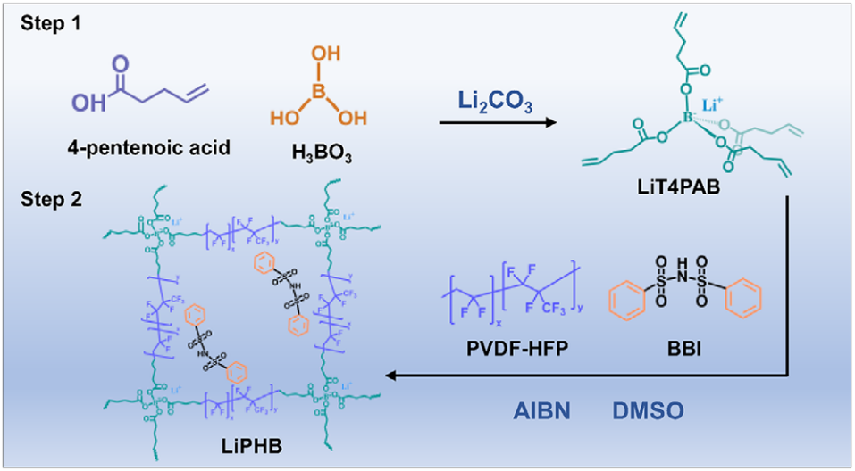 该研究提出了一种具有对称交叉结构和末端功能化C═C键的硼离子中心锂盐(LiT4PAB)作为单元,随后通过LiT4PAB与聚偏氟乙烯-六氟丙烯共聚物(PVDF-HFP)的化学交联构建了三维配位电解质(LiPHB)。由单键连接的硼离子中心单元表现出丰富的构象转变,在二苯基磺酰亚胺(BBI)的静电相互作用辅助下,实现了LiPHB的可变形结构。因此,LiPHB在受到冲击时能够发生自适应变形,表现出良好的延展性,弹性模量为1.4 GPa,最大伸长率为447.4%。此外,LiPHB展示了三维单锂离子传输通道,可引导均匀的锂沉积。结果表明,锂对称电池在30 °C0.1 mA cm⁻²条件下能够稳定进行沉积/剥离循环超过1500小时。Li/LiPHB SICPEs/NCM811固态电池在30 °C0.2 C倍率下循环150次后容量保持率为90.3%。该研究为动态单离子导电聚合物电解质的设计策略提供了新的思路,适用于固态电池。
